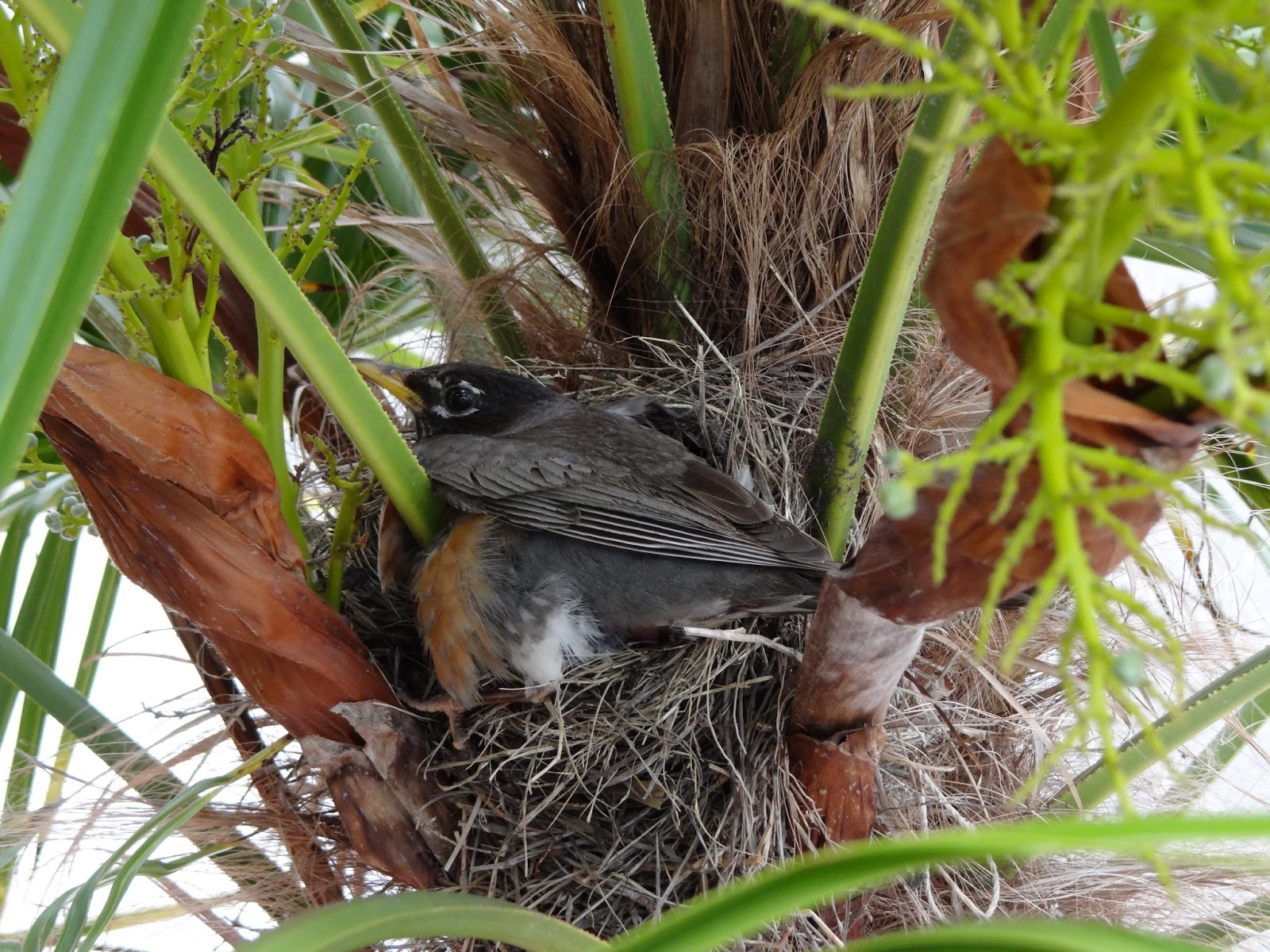 I had to look close when I first found this nest. This mother robin had really picked out a good spot and had her nest really secured in this palm tree.